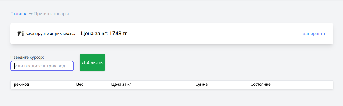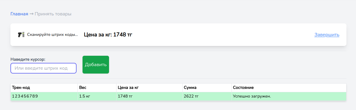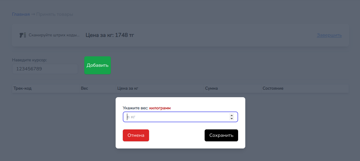 При каждом сканировании товара, выходит окошка для ввода веса, укажите вес товара и нажмите Сохранить(или клавишу Enter).